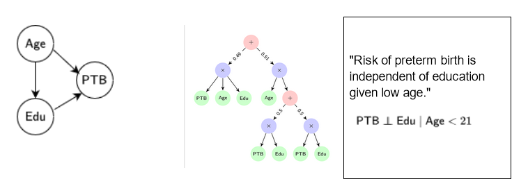 A Bayesian network (left) over three variables - Age, Education level, and risk of preterm birth, a Probabilistic circuit (middle) over the same domain, and domain knowledge (right) in the form of context-specific independence.