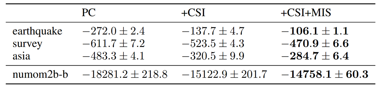 Generative performance of PCs learned from data and multiple forms of domain knowledge using our framework; we quantify performance using average test-set log-likelihood scores. PCs learned by exploiting multiple forms of knowledge (context-specific independence and monotonicity) outperform those restricted to only one form of knowledge (context-specific independence) and purely-data driven ones.