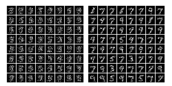 Images sampled from PCs learned from a modified version of MNIST digits data set. Instead of representing images of digits as grids of pixel intensity values, this data set represents them as point clouds. These point clouds exhibit permutation invariance – a symmetry difficult to model even for advanced generative models such as Generative Adversarial Networks (GANs) and Variational Autoencoders (VAEs). The figure on the left shows images sampled from a PC learned purely from data while the figure on the right shows images sampled from a PC learned by exploiting domain knowledge about symmetries in the point cloud.