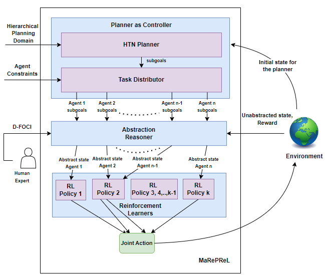 Multiagent Reinforcement Learning (MARL) introduces several challenges to sequential-decision making problems, including the curse of dimensionality dealing with an exponential state and action space, non-stationarity of the environment and credit assignment. When we include the added complexity of relational domains meant to learn policies that are generalizable to an increasing number of objects and tasks, traditioal MARL approaches are incapable of learning and scaling efficiently. Our work on Combining Planning and Reinforcement Learning for Solving Relational Multiagent Domains introduces a novel framework MaRePReL (Multiagent Relational Planning and Reinforcement Learning) that is designed to address these challenges by integrating hierarchical relational planning with reinforcement learning. This work extends to original RePReL framework to handle domains with multiple agents. Here’s how MaRePReL tackles problems in goal-directed relational domains.