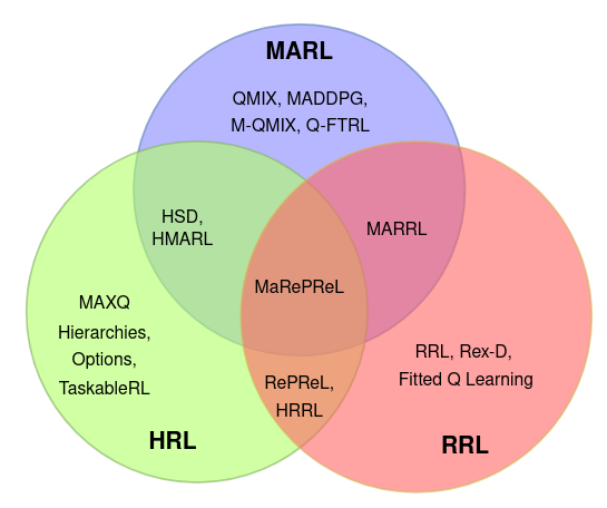 An ideal RL framewrok should be able to not only handle the rich relational structure of the domain but also have the ability to represent and reason with the decomposition of complex tasks into smaller ones. In other words, the algorithm must be capable of representing and reasoning with both hierarchies and relational structures. RePReL, employs a hierarchical relational planner to implement task-specific policies and uses Deep RL to work on hybrid relational domains. However, while RePReL framework successfully handled relations and hierarchies in continuous spaces, it can not handle multiagent systems. More precisely, given the three-pronged challenge of complex task structures, rich object-centric environments, and multiagent domains, several advances have been made in each of these specific directions in the areas of hierarchical reinforcement learning (HRL), Relationala Reinforcement Learning (RRL) and Multiagent Reinforcement Learning (MARL). Also, in the recent past, methods that arise from the combinations of these methods as seen in the figure. However, no significant research encompasses all three of these challenges.