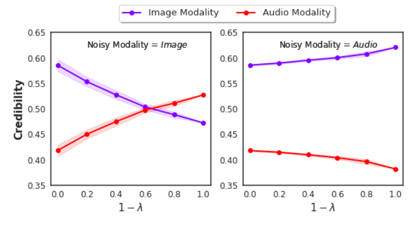 To do so, we construct noisy versions of the AV-MNIST dataset by introducing varying degrees of noise into one of the modalities, keeping the others fixed. The figure above shows the relative credibility assigned to each modality as the noise in one of the modality increases. The credibility is averaged over data points in the test set. In both settings, the credibility score of the noisy modality decreases as noise increases, while that of the non-noisy modality increases.